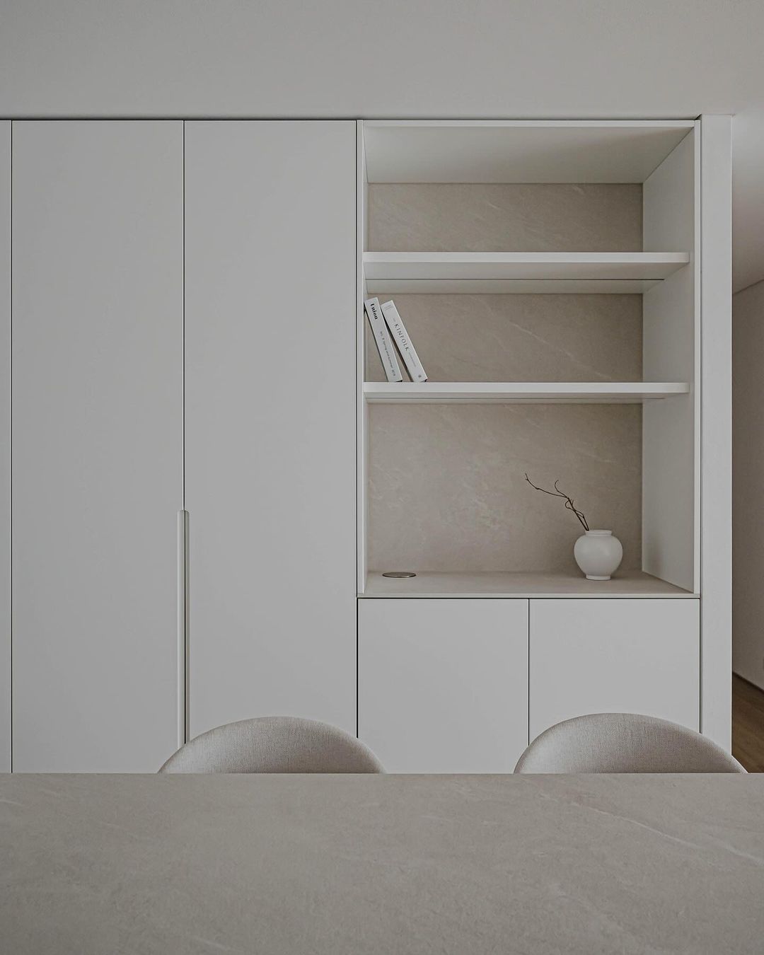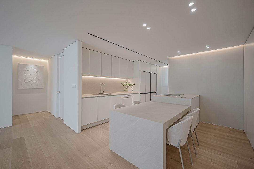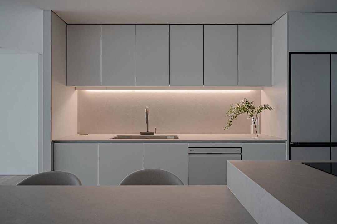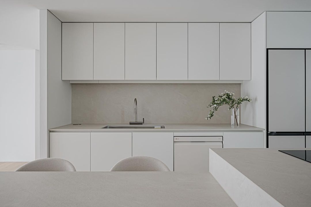 미니멀은 사실 고도로 섬세한 작업입니다. 자칫하면 그냥 밋밋하거나 비어있다는 느낌만 들 수 있으니까요. 그래서 미니멀한 콘셉트의 인테리어에서는 톤을 맞추되, 다양한 자재를 사용해 변주를 시도합니다. 이번 포스팅에서 소개해 드릴 주방 인테리어는 그 사례를 잘 보여줍니다. 화이트-아이보리의 단정한 주방 인테리어입니다.