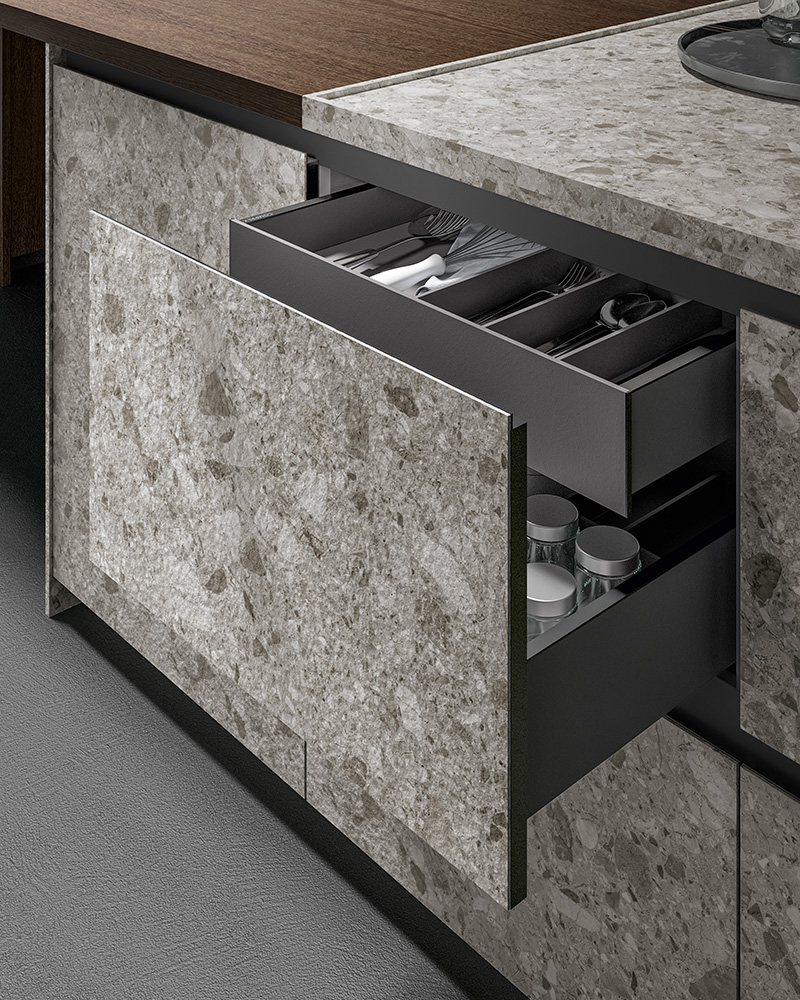 그레이 테라조 디자인의 이날코 이세오(Iseo)로 제작한 대형 아일랜드에요. 매우 전문적인 주방의 모습입니다. 우드와 함께 매칭해 그윽함을 더해주었어요. 이세오는 강바닥에 깔린 다양한 바위와 자갈의 모습을 연상시키는 디자인인데요. 크기와 색의 농도의 낙차가 큰 칩 덕분에 그 자체로 역동적인 모델입니다.