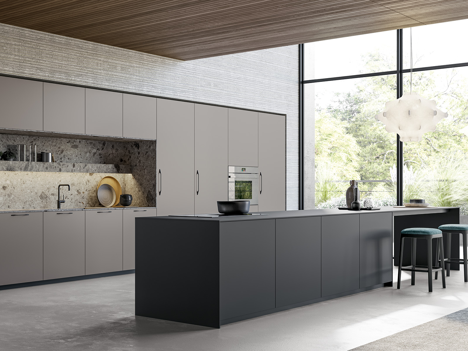 한편, 아일랜드는 진한 그레이 톤으로 메인 주방은 벽체와 상판은 이세오로 마감한 주방은 보다 모던한 분위기를 연출해 줍니다. 이때 이세오(Iseo)는 강렬한 포인트가 되죠. 그레이 톤온톤 인테리어를 할 때 이세오처럼 포인트를 주기 좋은 자재는 참 반가울 것 같습니다. 만약 여기서 이세오가 빠진다면 밋밋하고 특징 없는 인테리어가 될 수도 있었을 것 같아요.